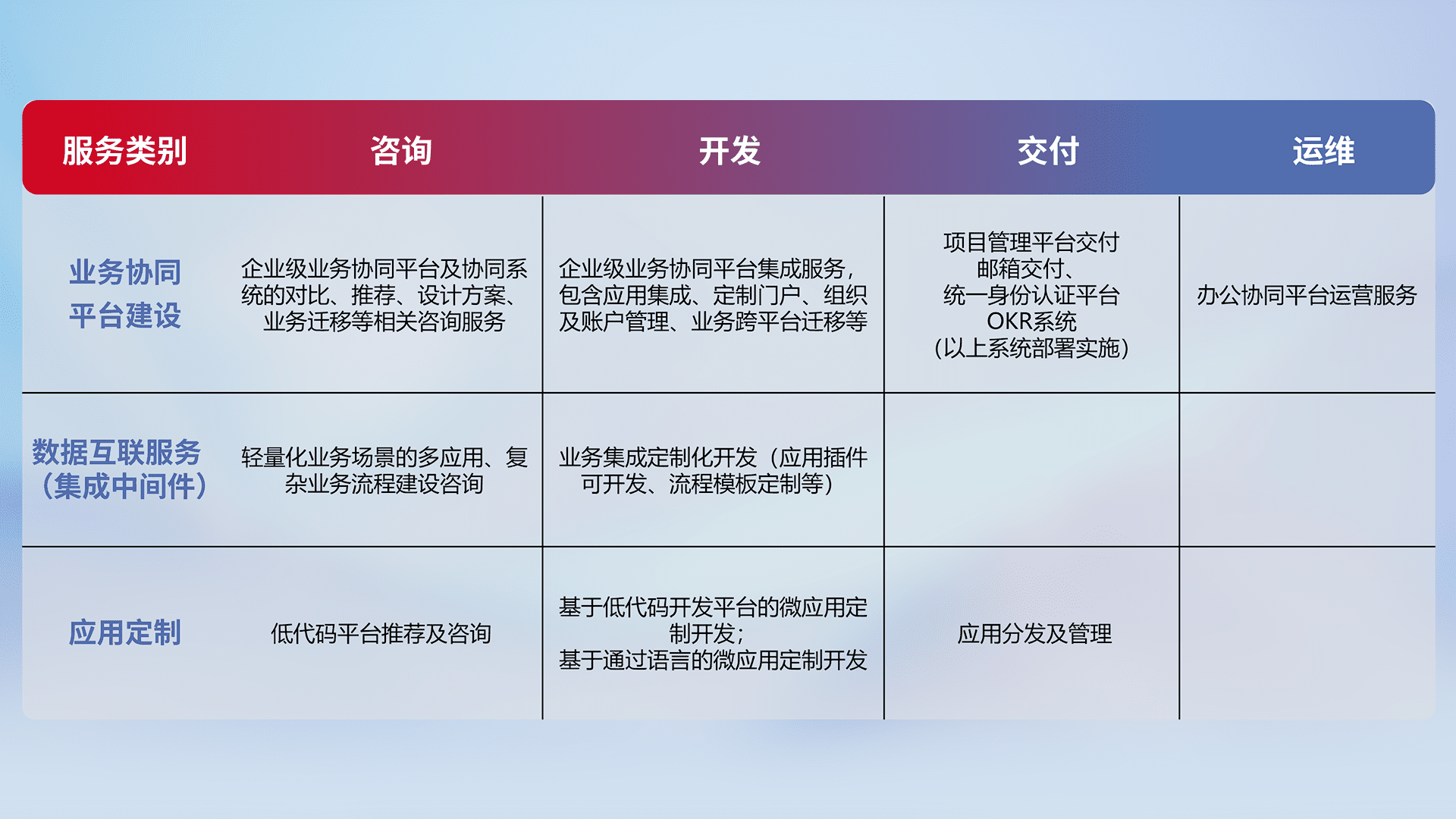 针对钉钉、、、、企微、、、、IDaas等平台级产品提供产品的规划、、方案、、交付、、、定制化开发等服务,,实现如统一协同办公、、智能客户服务、、、、混合会议管理、、智能数据查询、、等业务场景,,实现数字化转型。。。